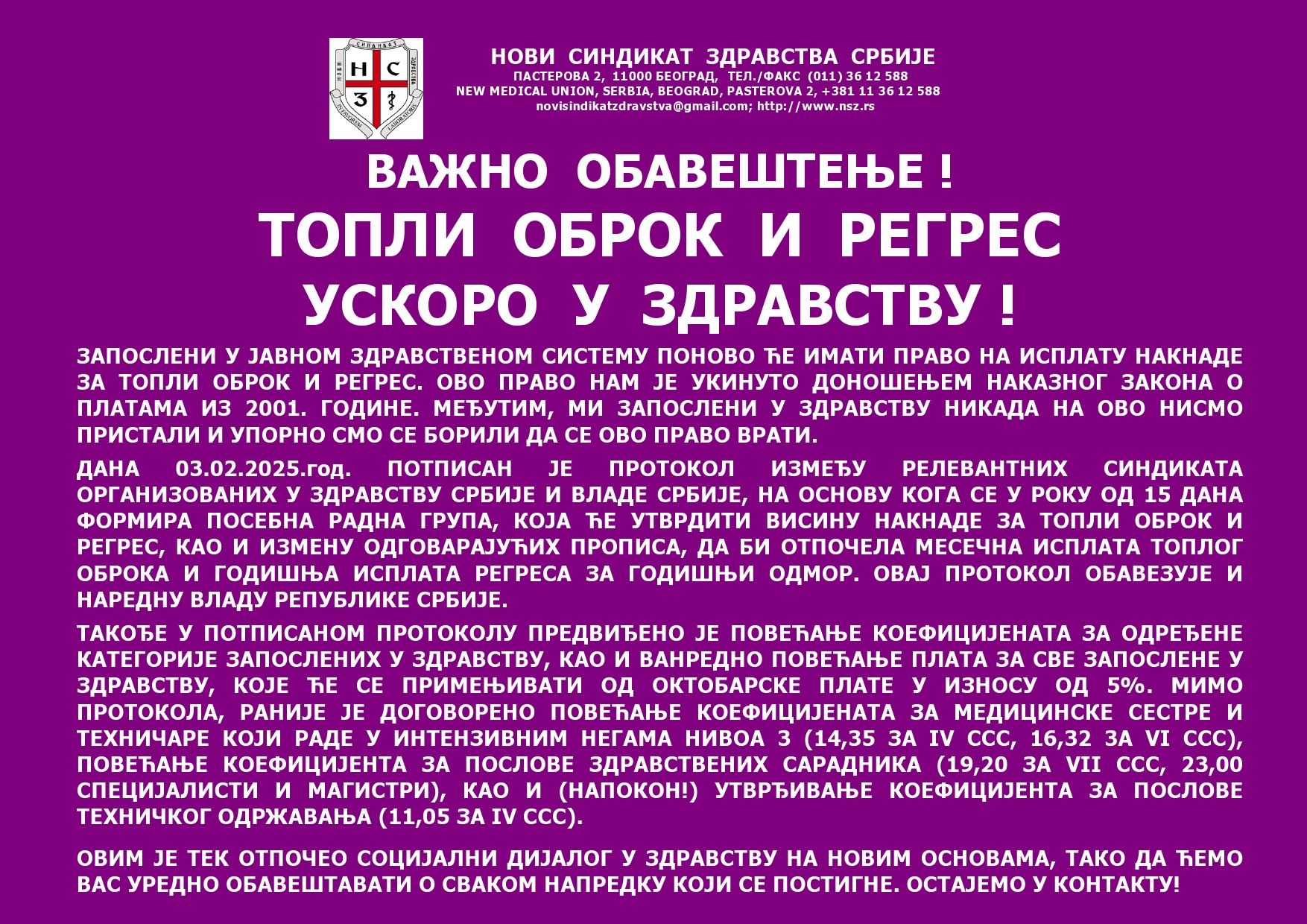 ТОПЛИ ОБРОК И РЕГРЕС – УСКОРО У ЗДРАВСТВУ! Нови синдикат здравства Србије novisindikatzdravstva@gmail.com 064/13 57 083; (011) 3612-588